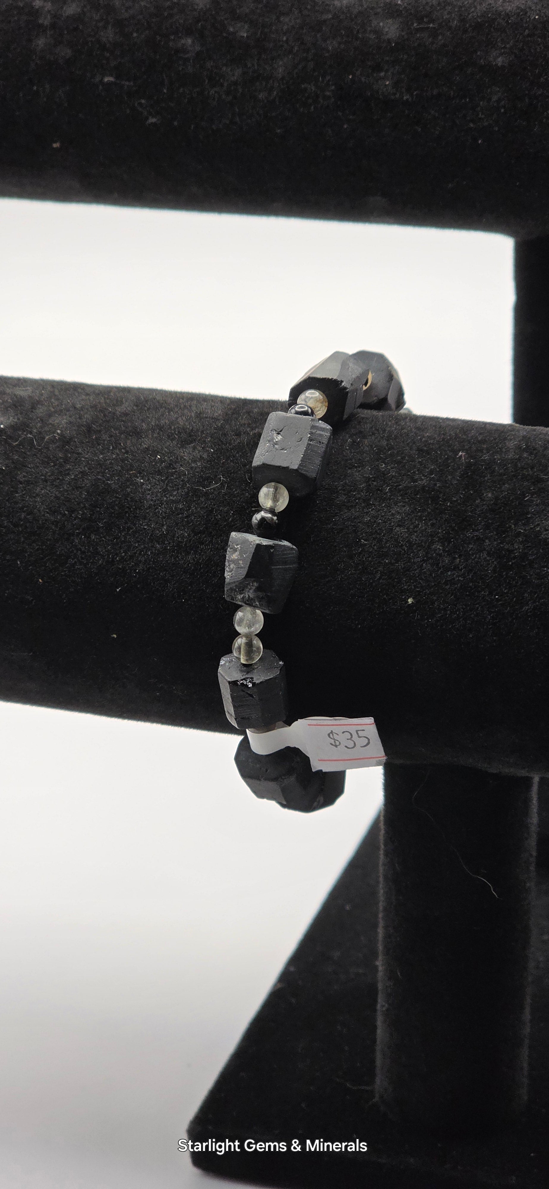Black Tourmaline Barrel Bracelet, w/Quartz & Tourmaline Beads.