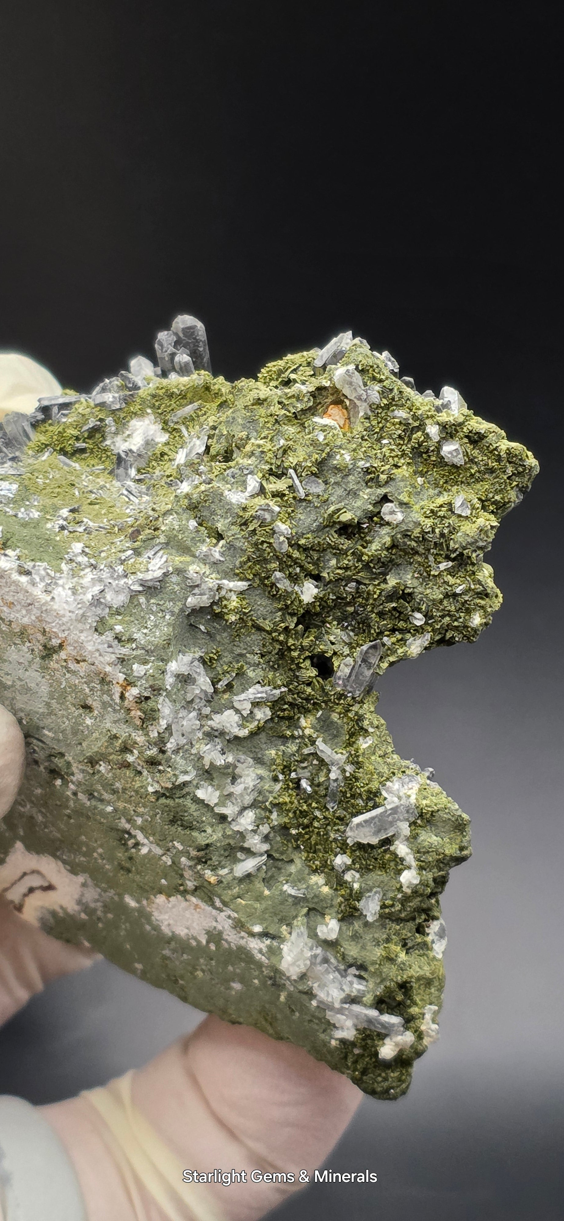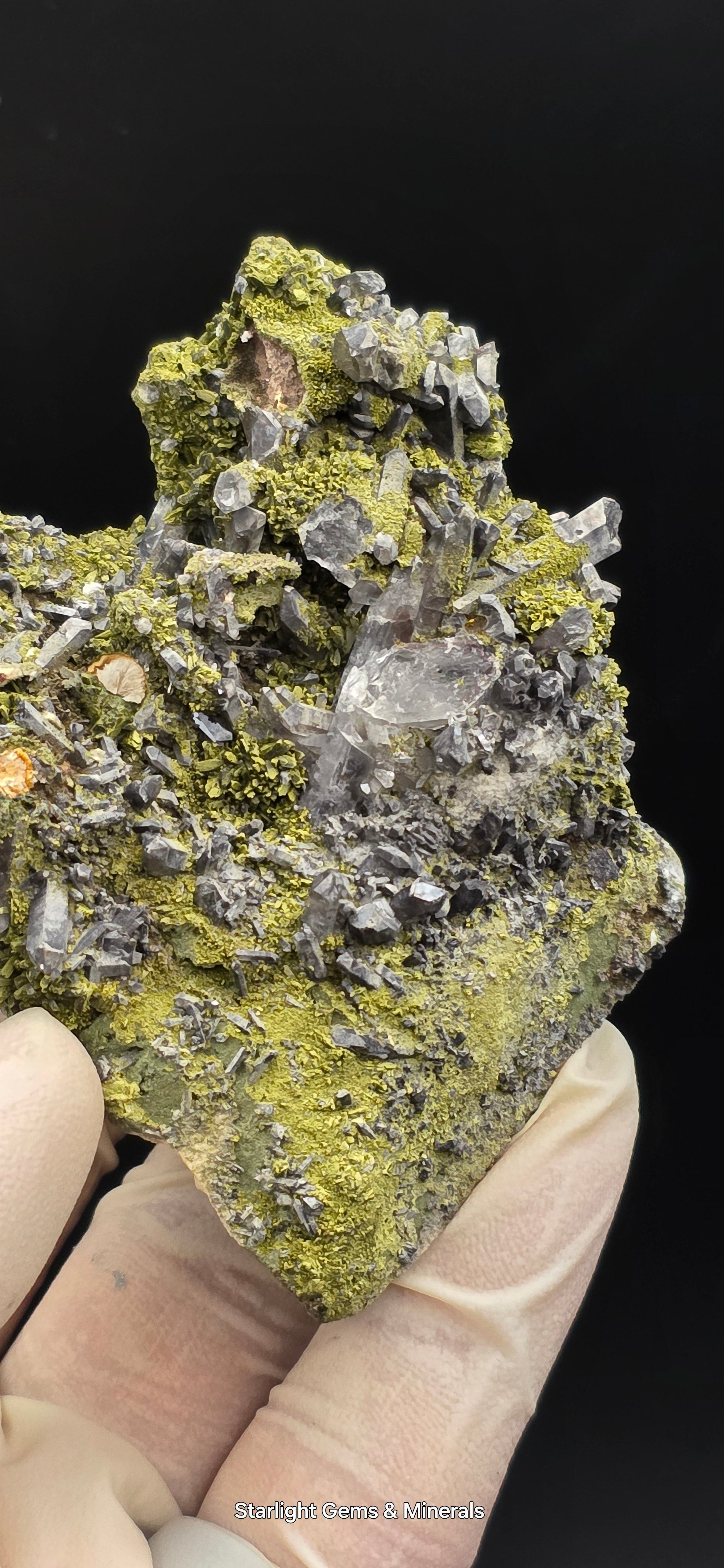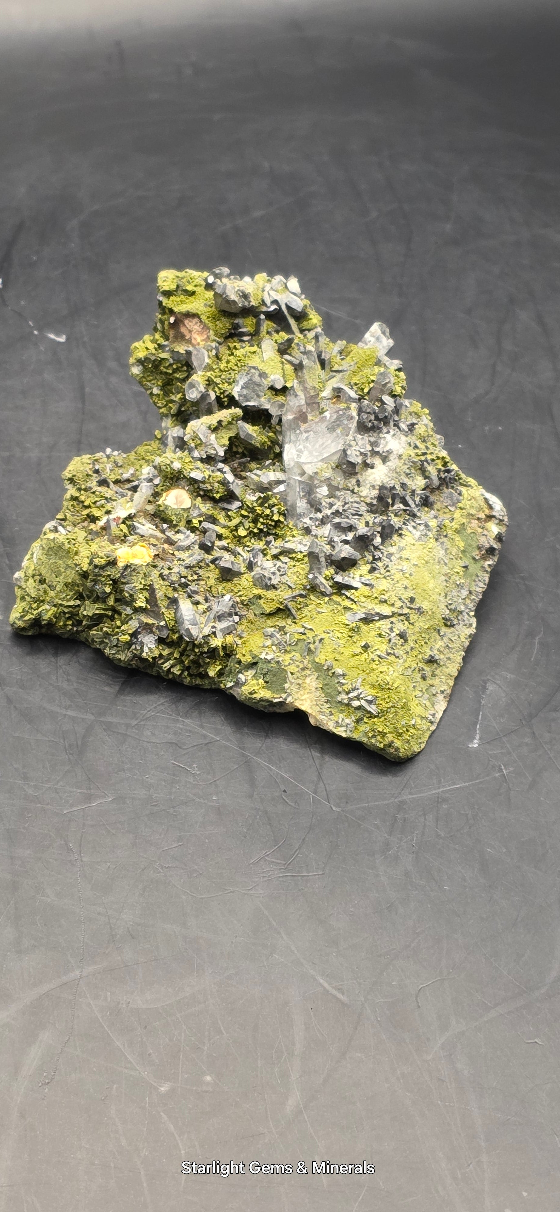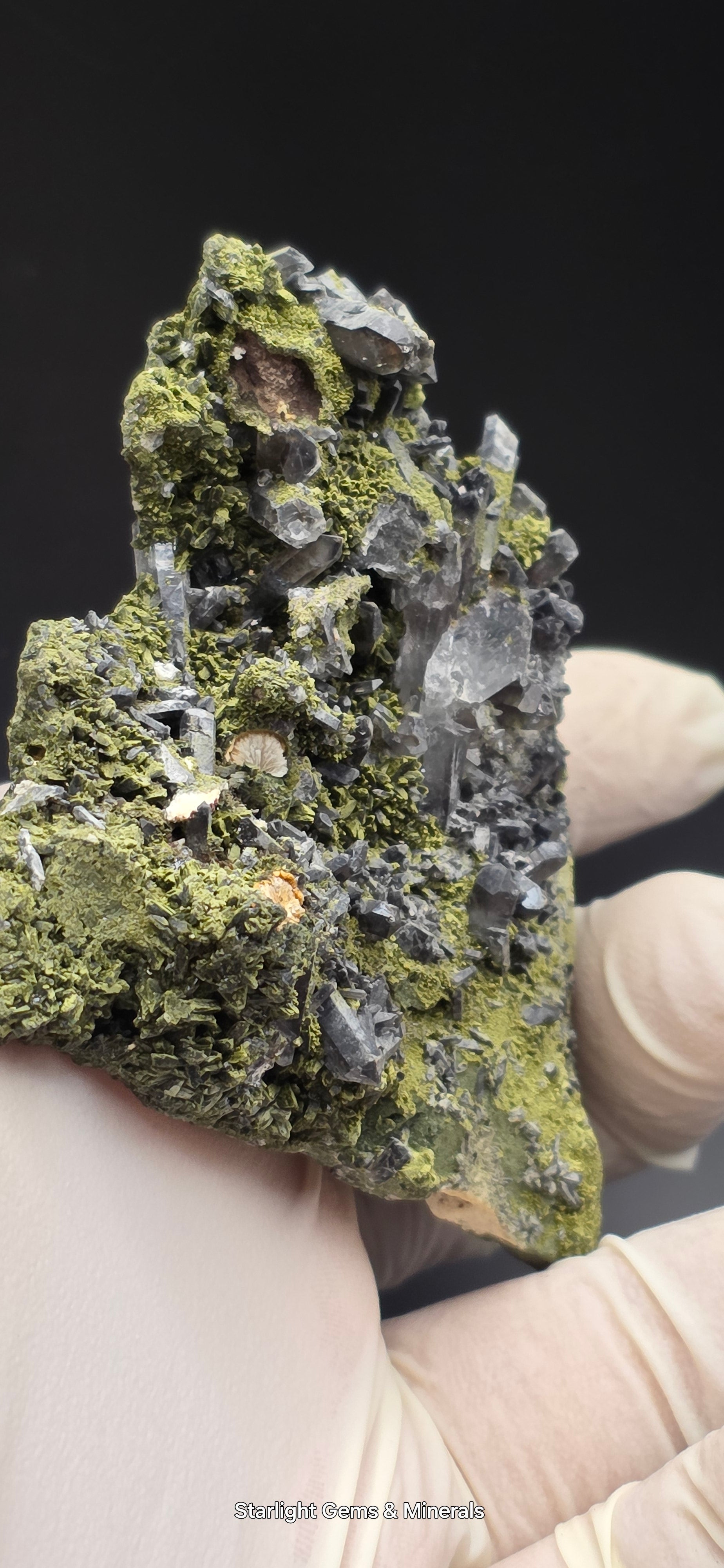 A prehistoric Epidote forest with Chlorite and Epidote Inclusions filling the Smokey Super Seven Quartz Matrix, with beautiful quartz phantoms! A breathtaking micro scenery sure to captivate the eye of the beholder