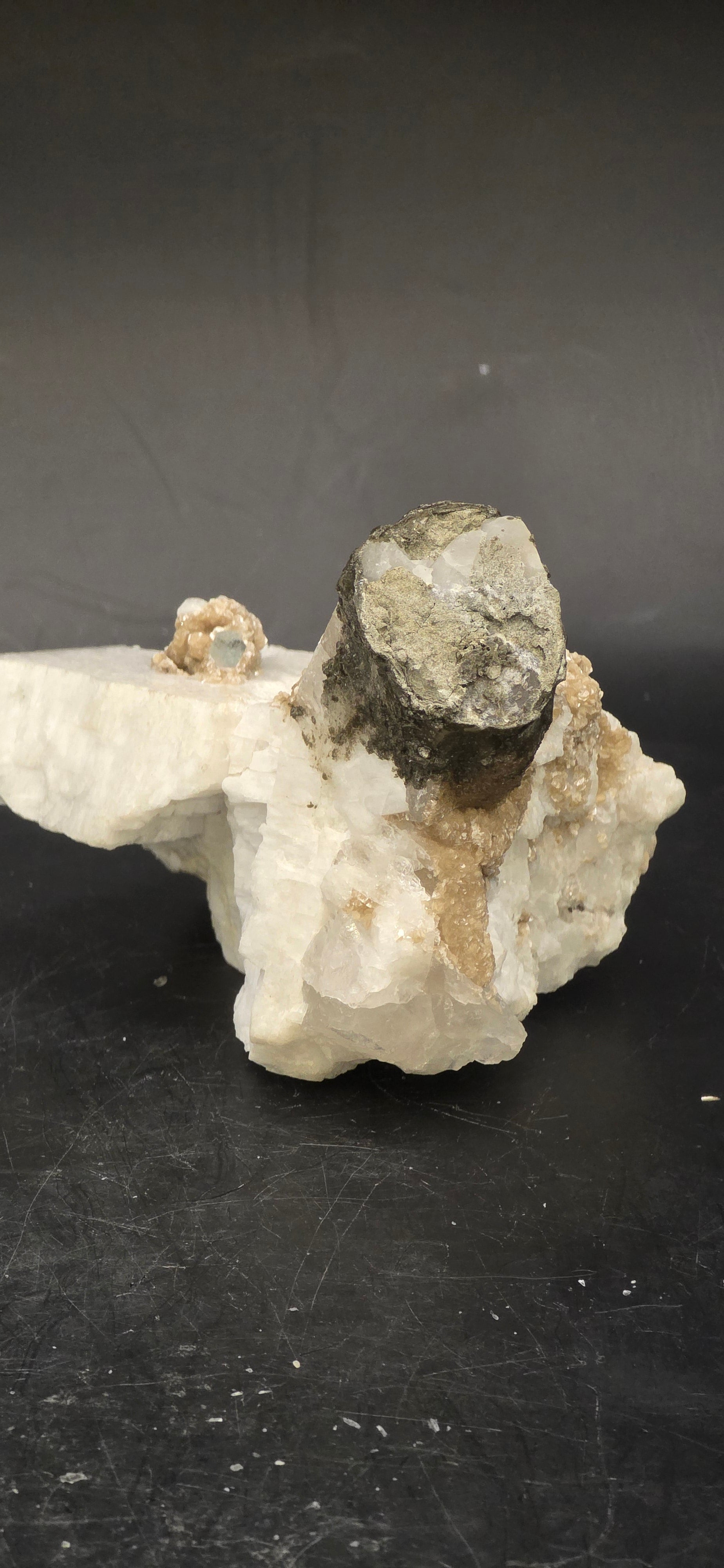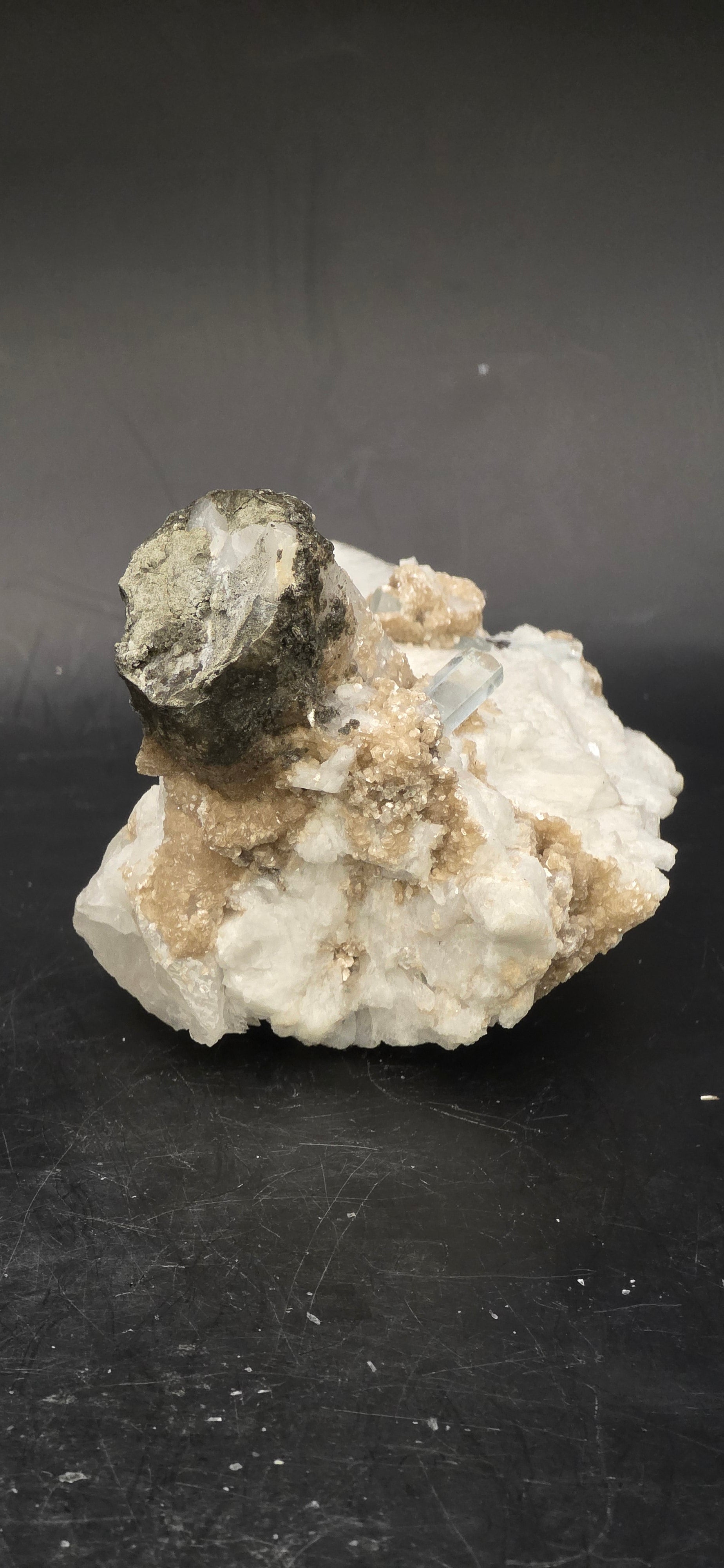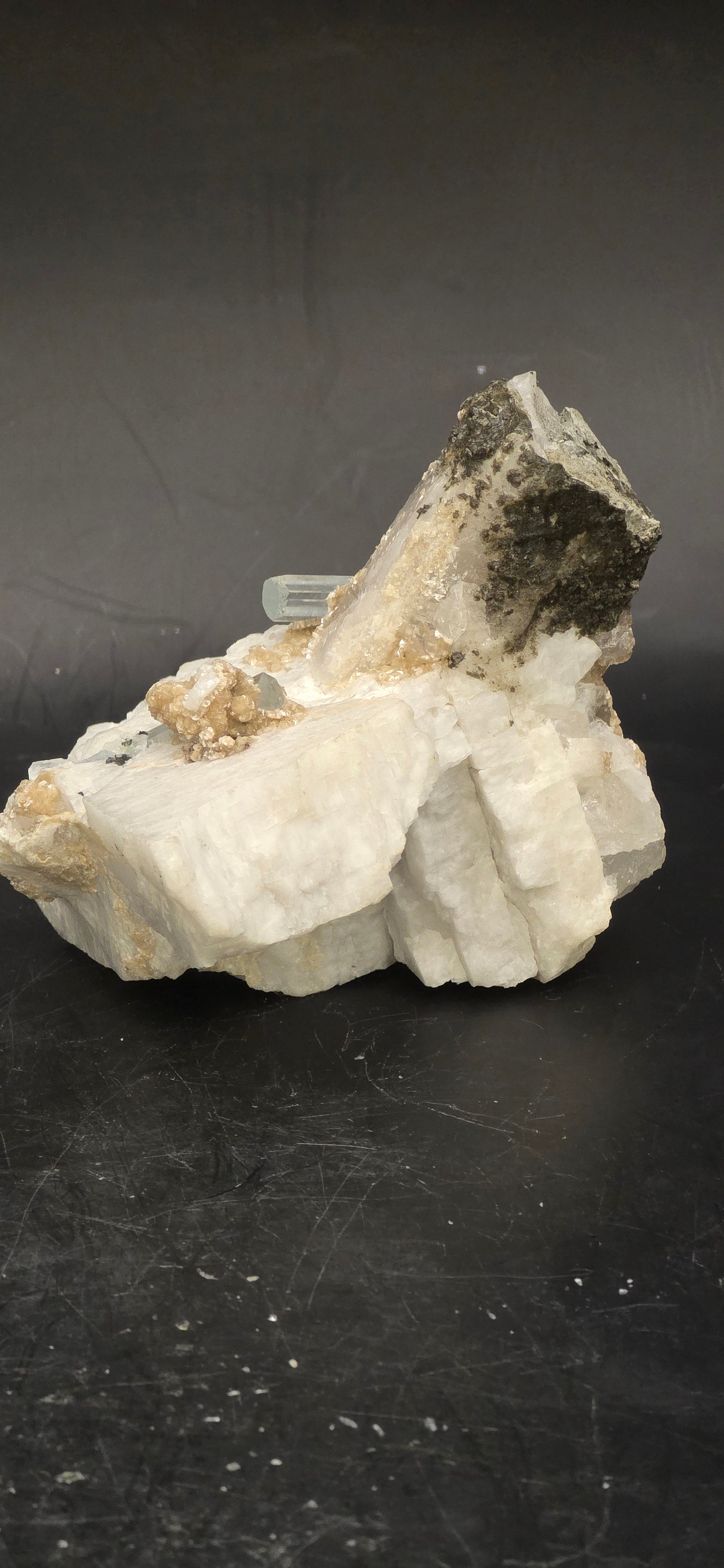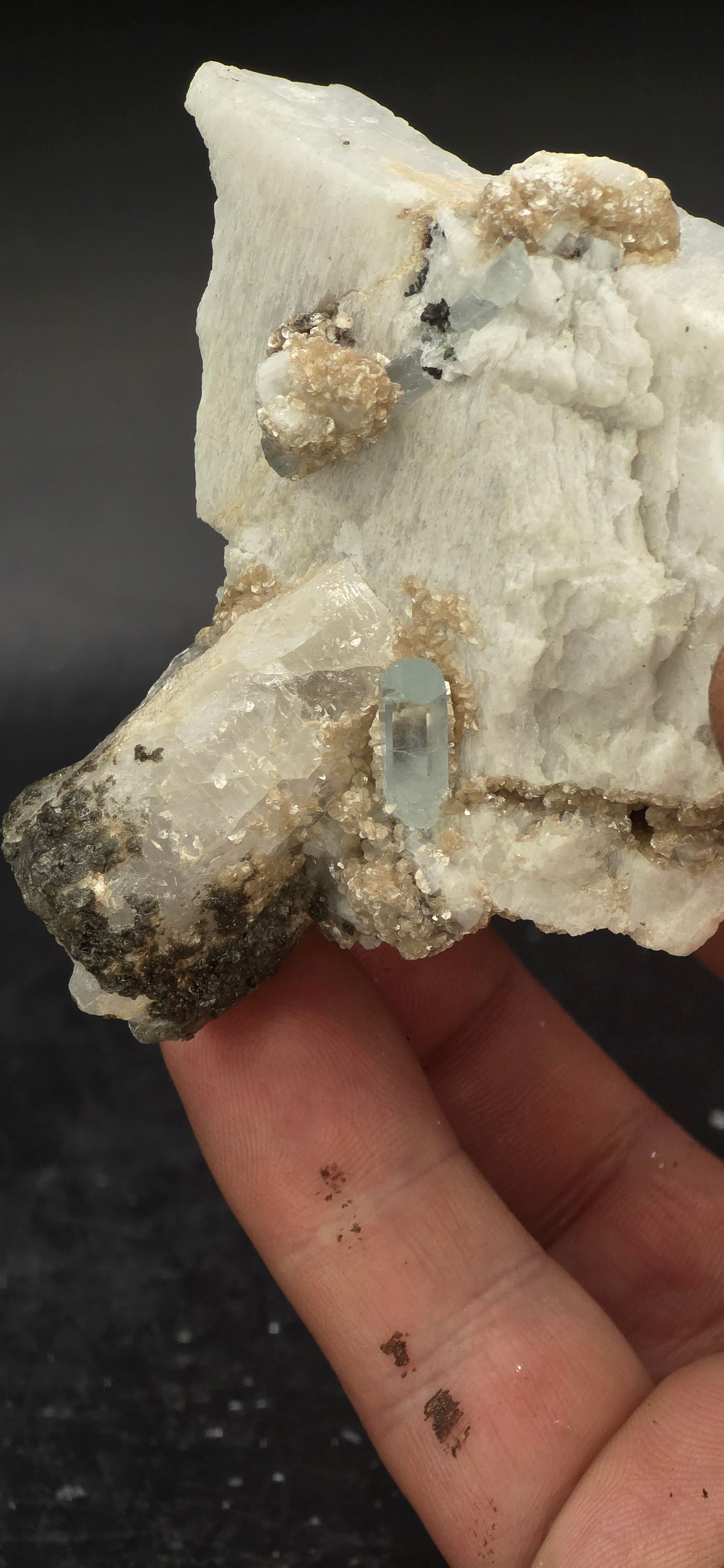 Erongo Region Namibian Aquamarine Matrix w/ Beautiful Micha, Quartz, Stunning UV/PL Calcite Coating, and Fluorite.As the primary crystals